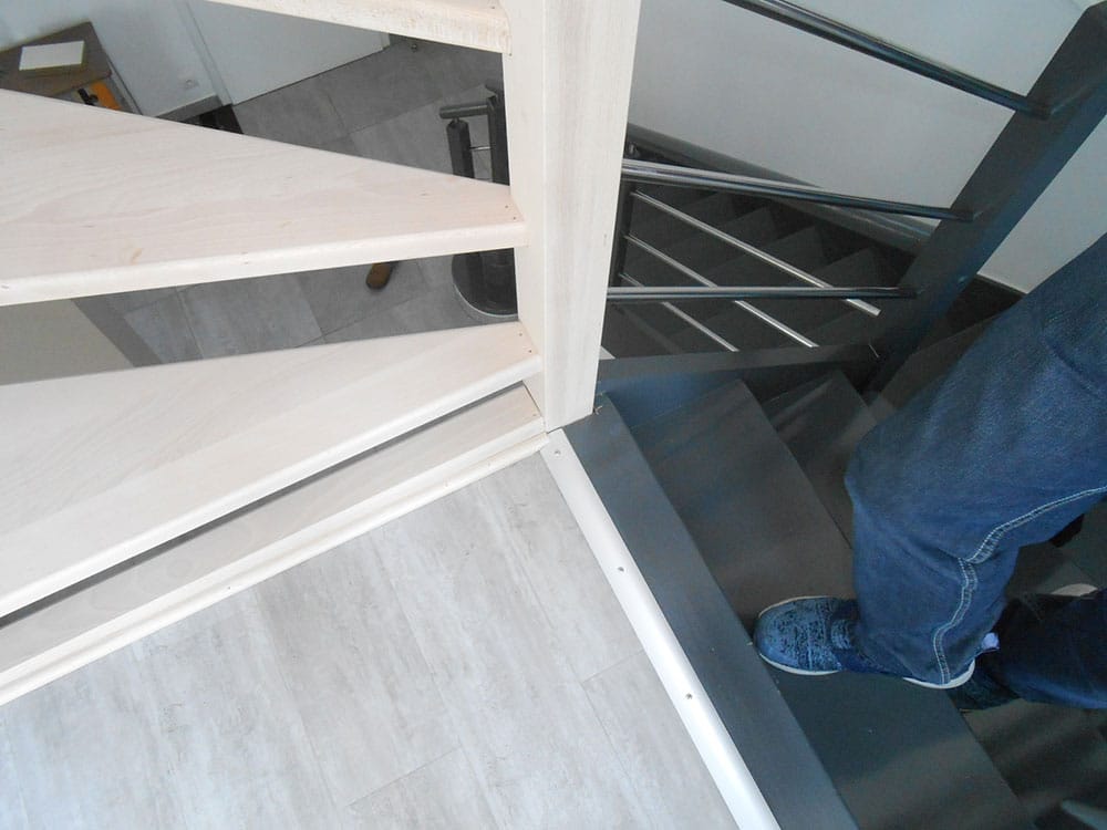 La création d’un espace polyvalent desservi par un escalier suspendu au dessus de l’escalier existant.